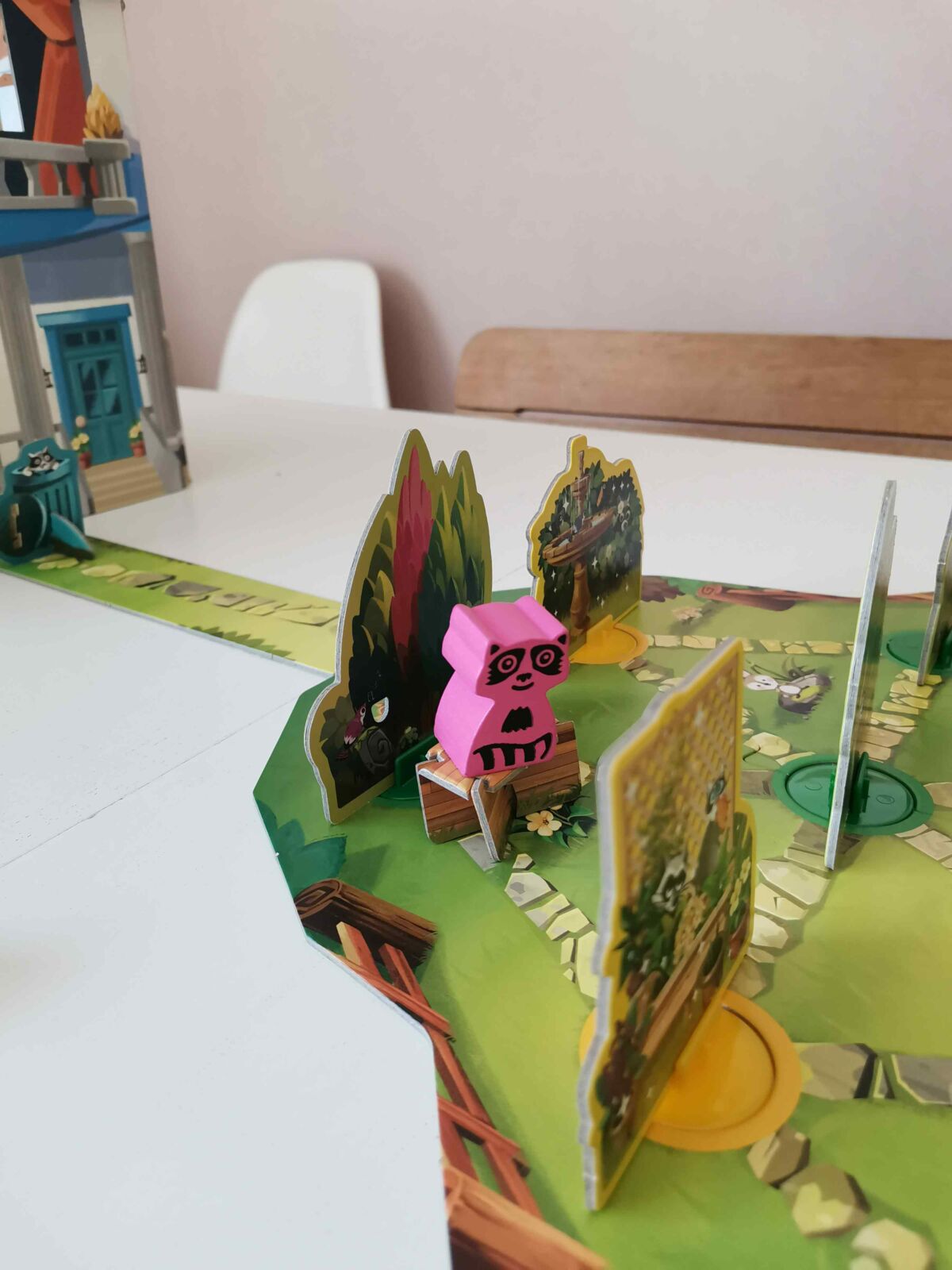 On peut complexifier le jeu en ajoutant les 2 bancs , pas très stables. Si un banc est placé derrière l’obstacle le raton laveur devra être dessus , à ses risques set périls.