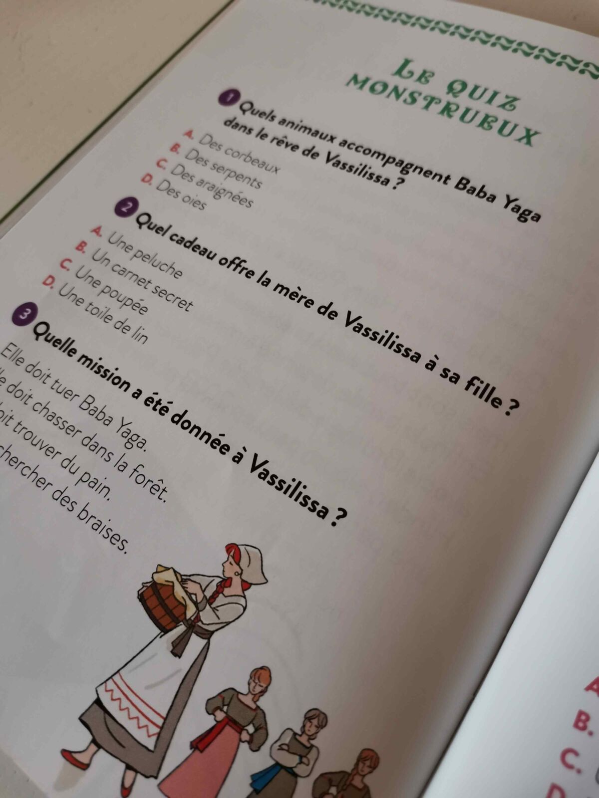 Ici on a découvert baba Yaga, la sorcière de la forêt. Vassilissa a perdu sa maman et son papa s’est remarié. Mais sa belle maman n’est pas très gentille avec elle. La maman de Vassilissa lui a offert une poupée qui lui remonte le moral quand ça ne va pas et l’aide dans ses tâches. Un jour elle va devoir partir chez Babayaga , une femme canibale , pour aller chercher du feu. Mais que va t’il se passer ?